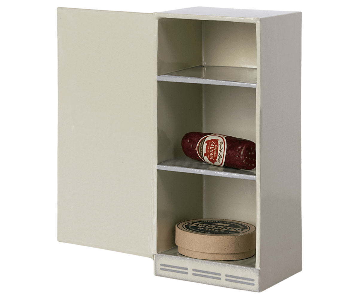 The perfect place to store your groceries so they stay fresh and cold. Inside the cooler, you find a small sausage and cheese. The cooler is made of cardboard and fits perfectly into the mouse castle.