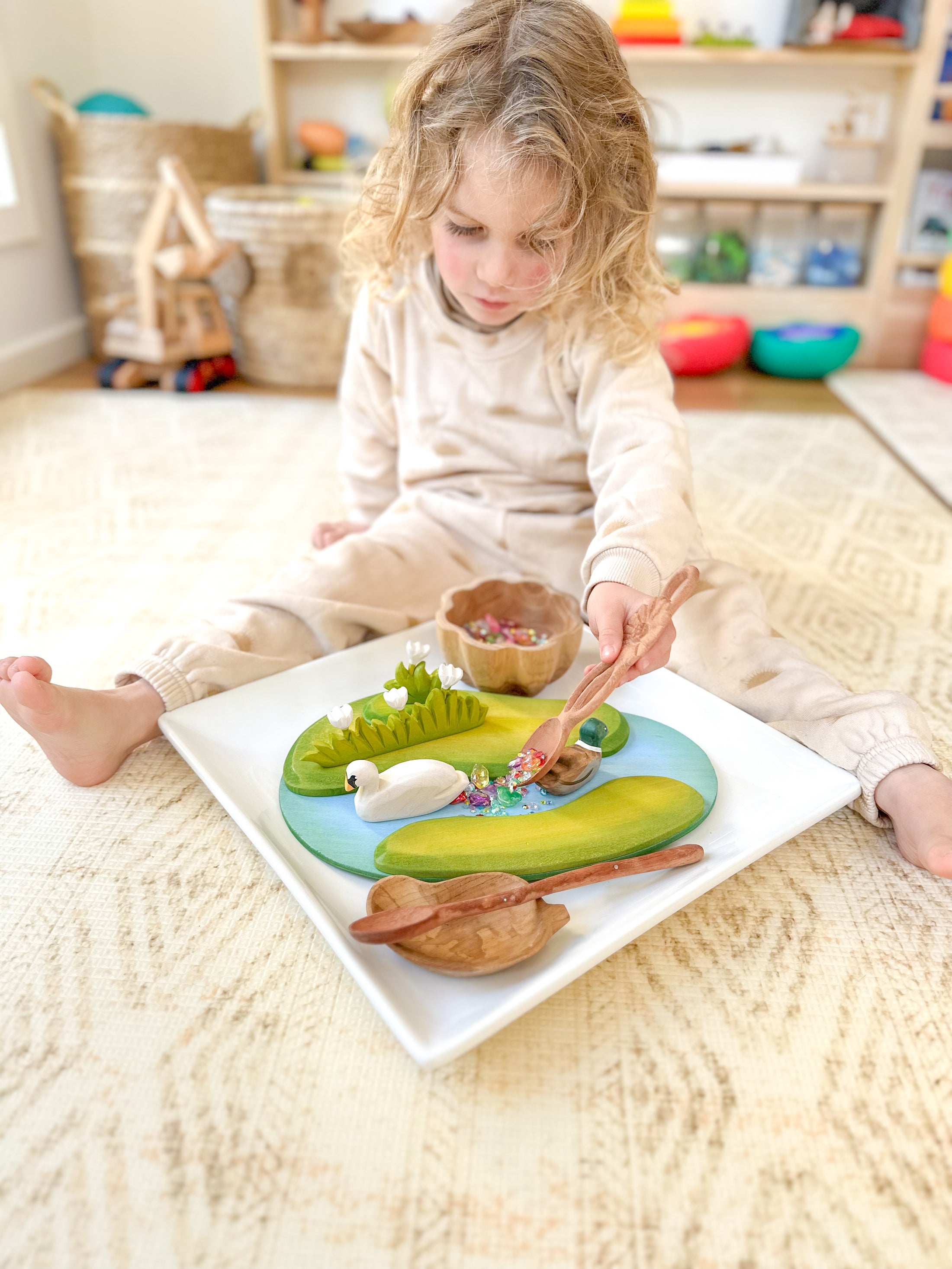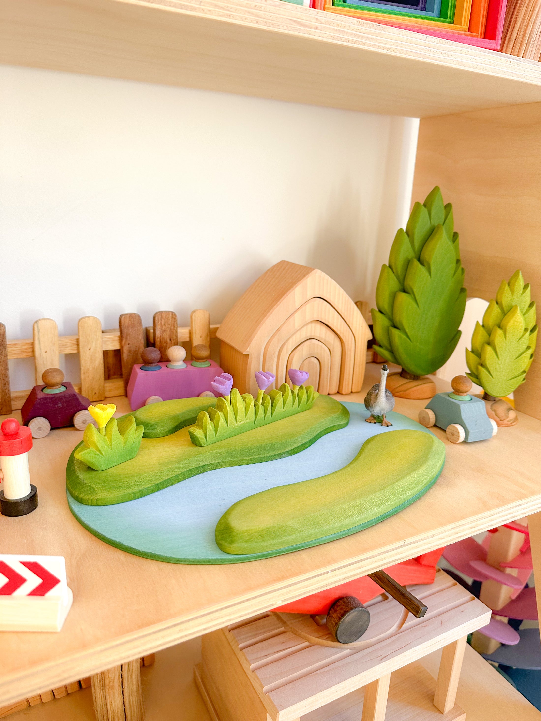 The Bumbu Toys River Plate is an ideal spot for your little animal friends to hang out. With its various layers and heights, it creates a sense of dimension. Hand-painted in lush green and crystal blue, this plate brings the beauty of nature to life in your play area.