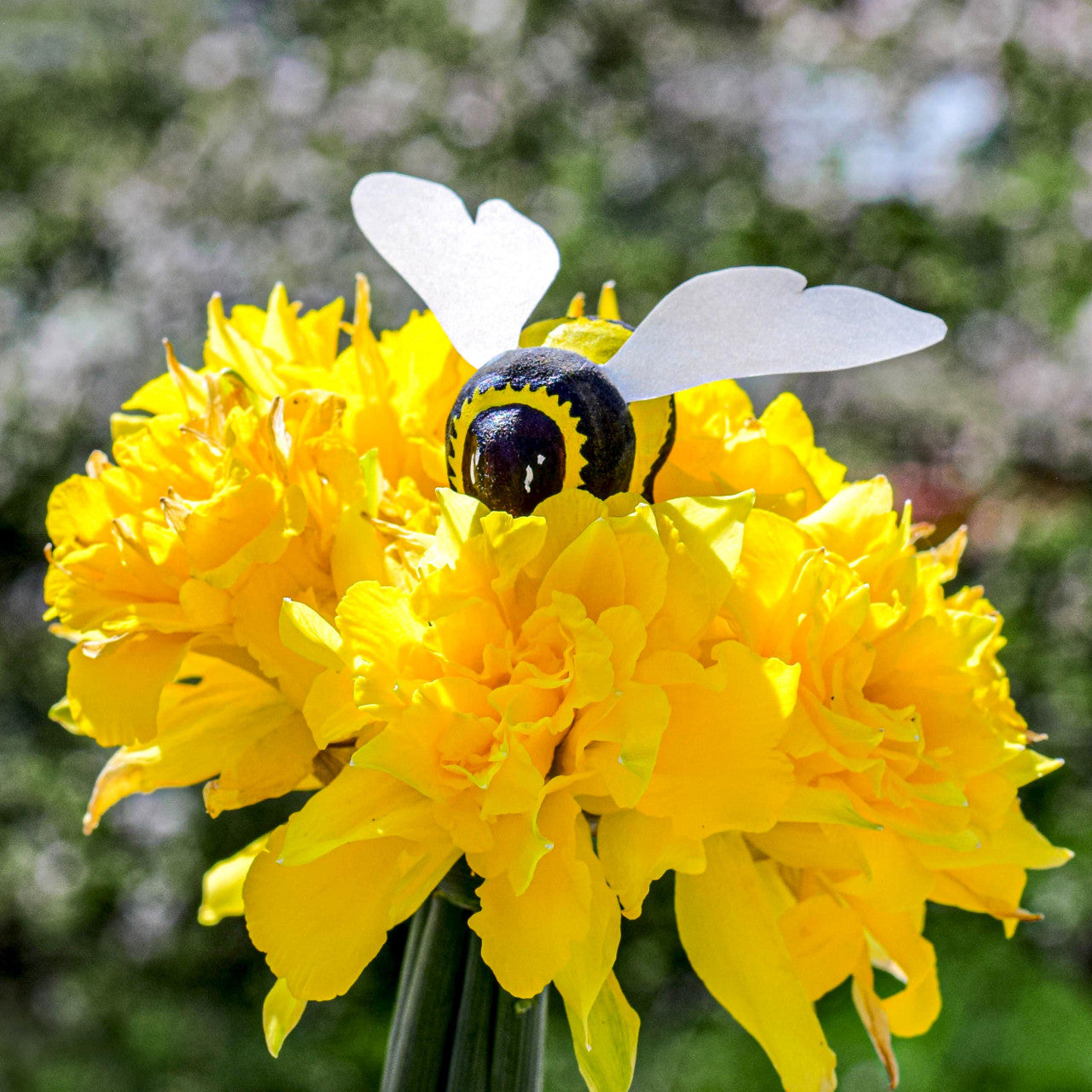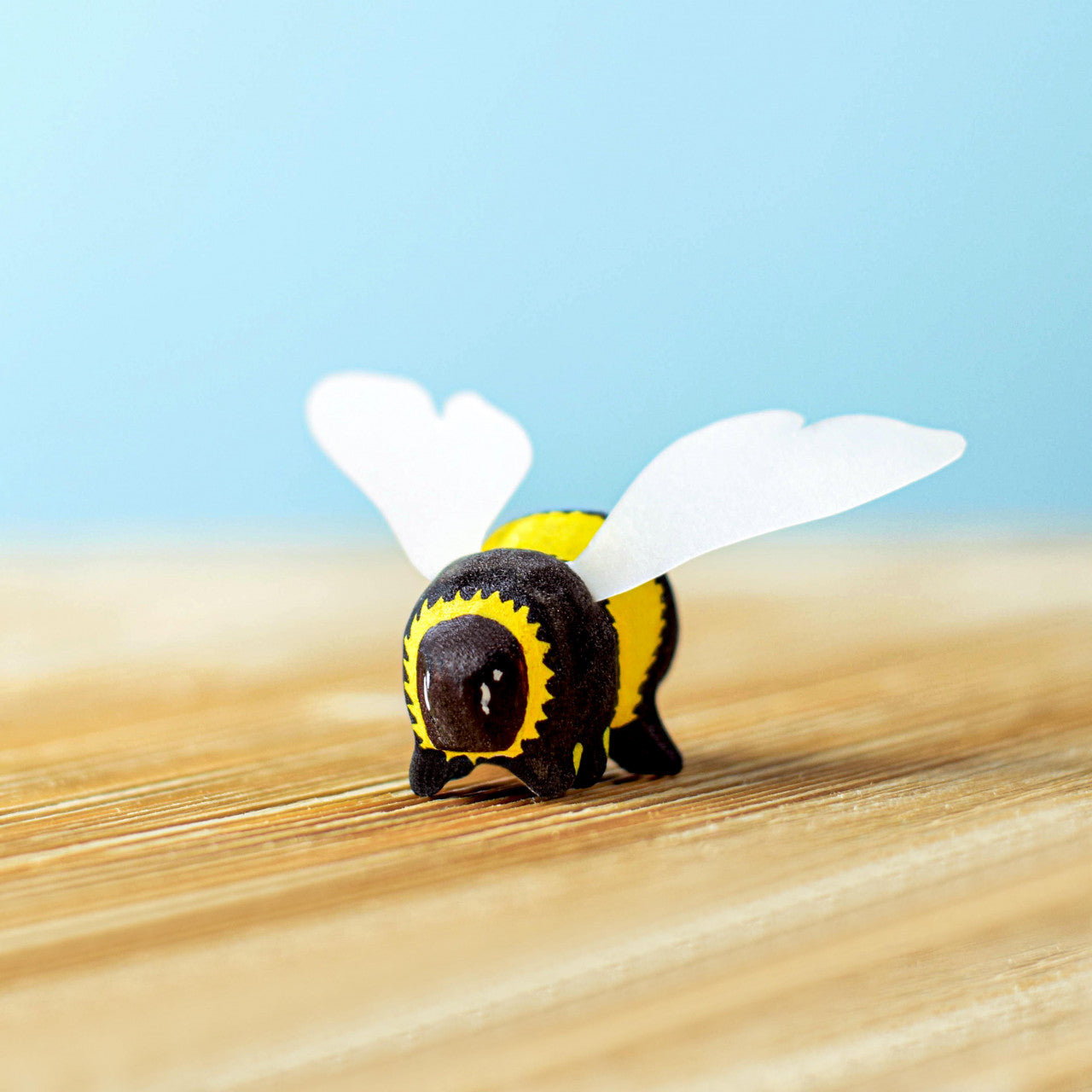 The BumbleBee toy is skillfully crafted from sustainable wood, featuring a vibrant yellow and black design with intricate details.