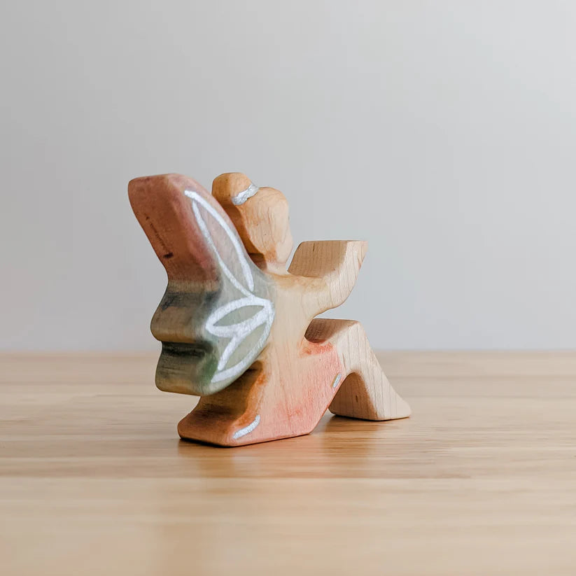 Sitting among a copse of trees over looking a meadow of wildflowers, this darling fairy looks skyward in the hopes a butterfly might land upon her hands. She is adventurous and kind, and very much looking forward to joining a new family. With an ombre rainbow colouring and sliver accents that glitter in the light, she is sure to be a favourite in the playroom and on adventures.