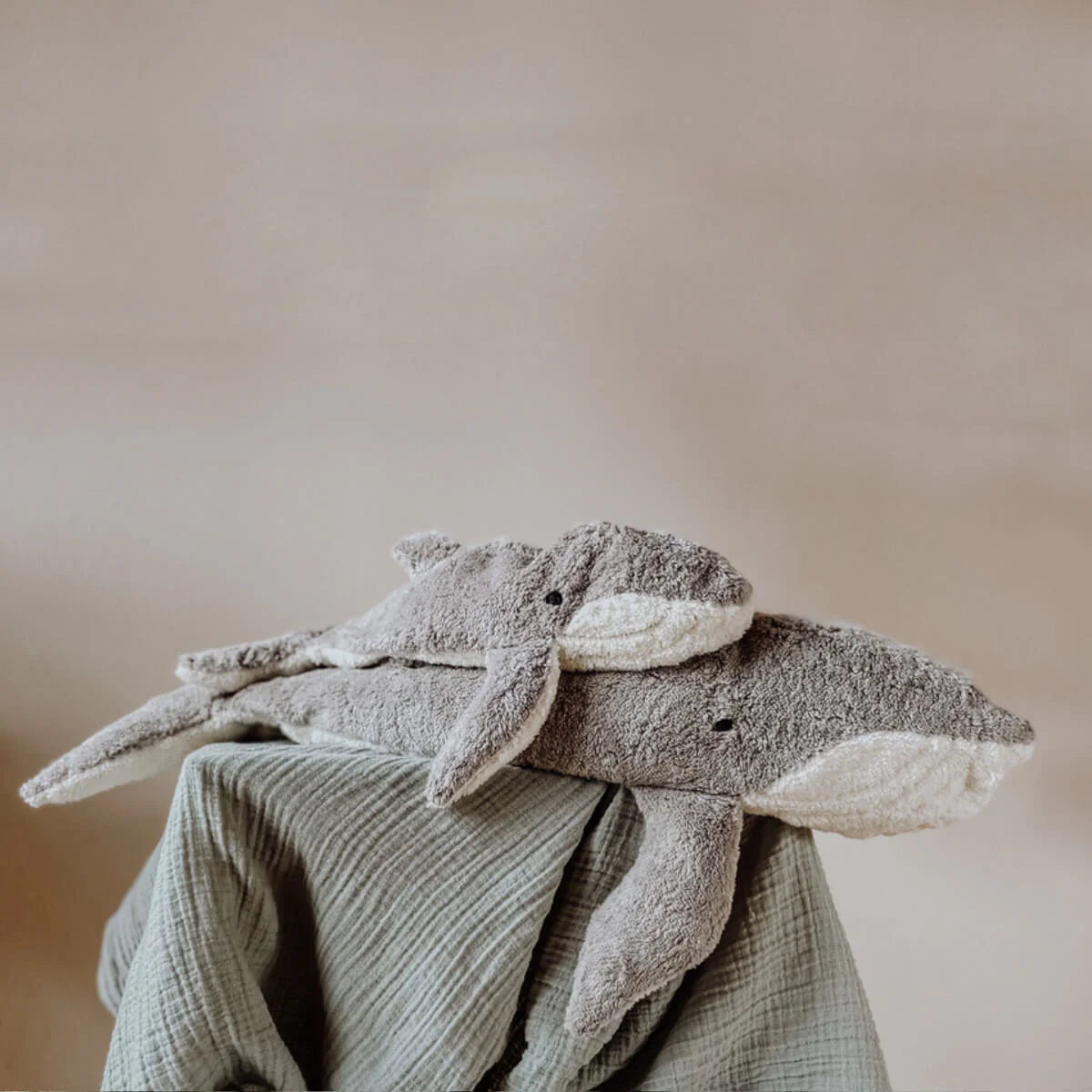 The SENGER Cuddly Large Whale is a soft and cuddly toy that doubles as a weighted toy and a gentle heat bag for children.