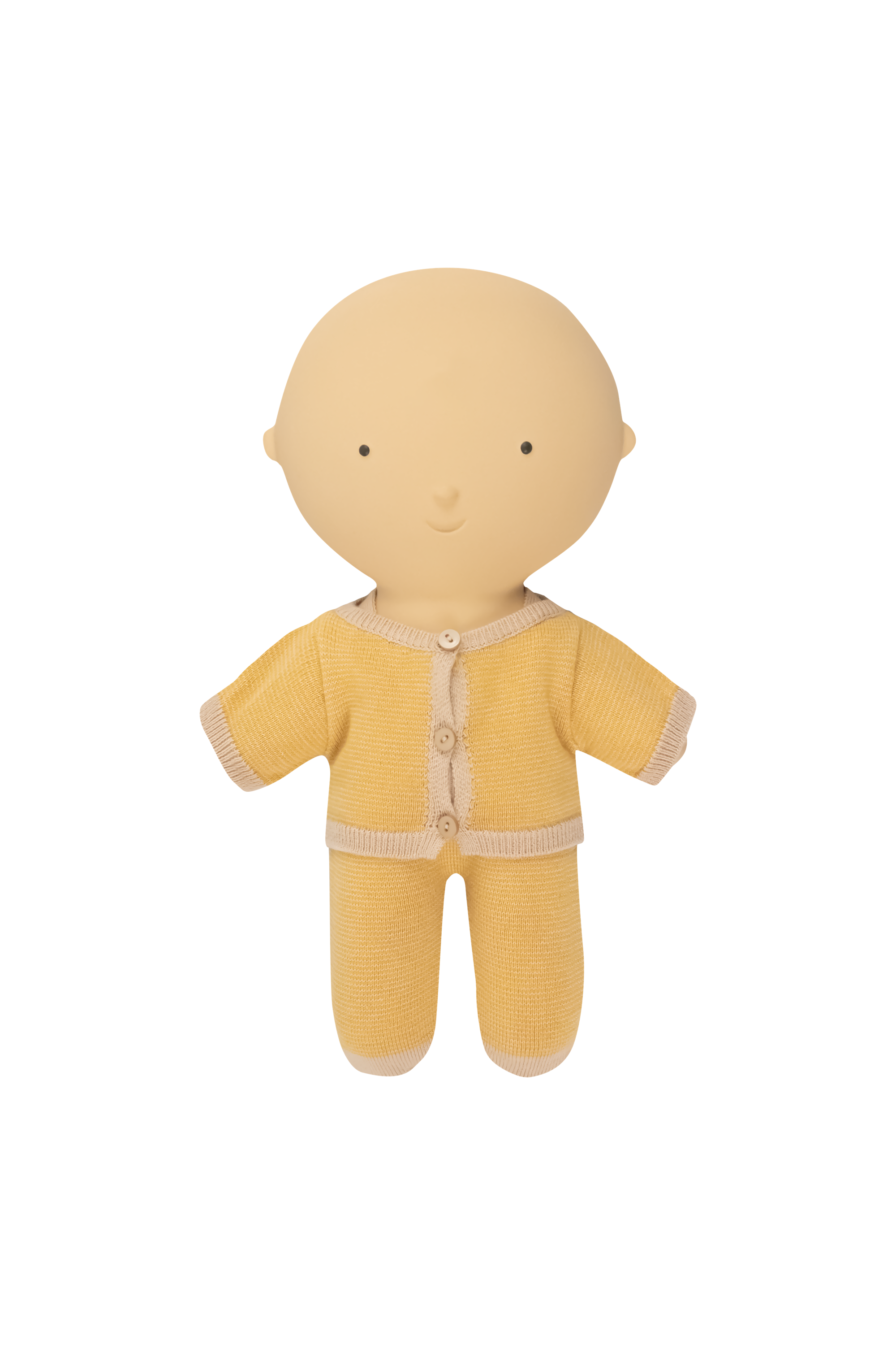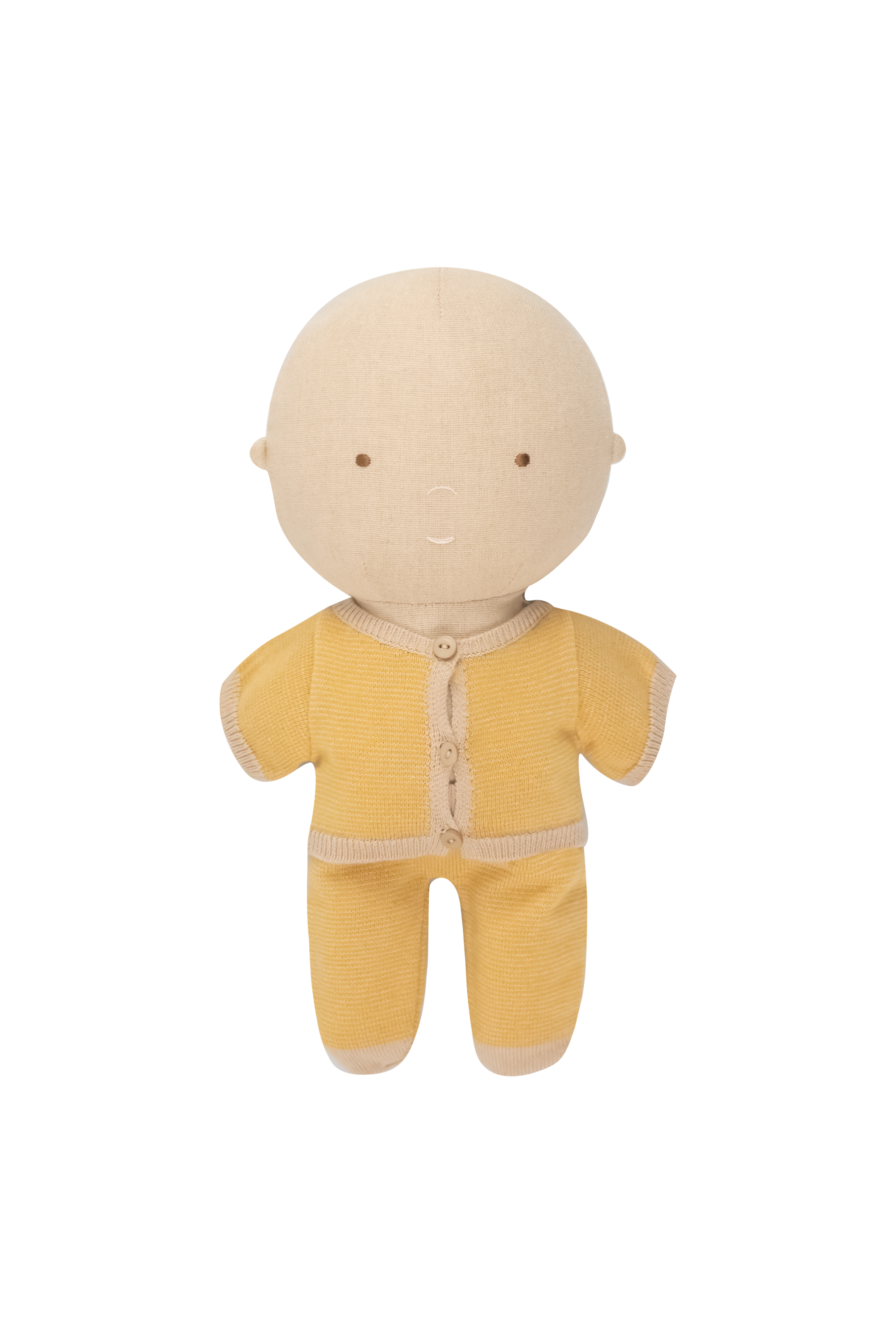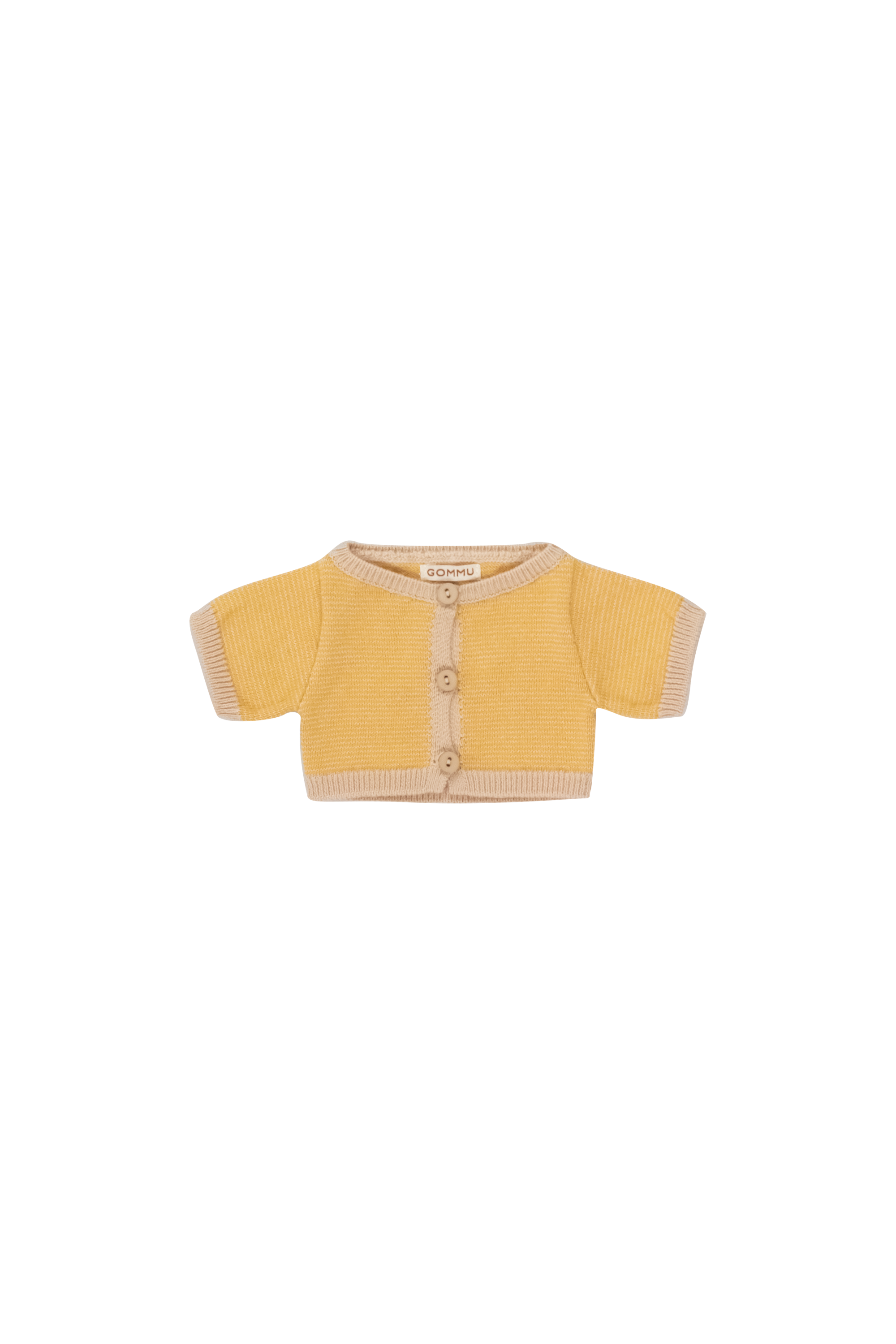The GOMMU Cardigan in LIGHT CREAM AND MUSTARD MICRO STRIPES is a soft, stylish layer in delicate stripes, made to fit both Big GOMMU and Baby GOMMU Soft dolls. This cozy cardigan made of 100% cotton, adds a charming touch to doll outfits, enhancing play and supporting fine motor skills development.